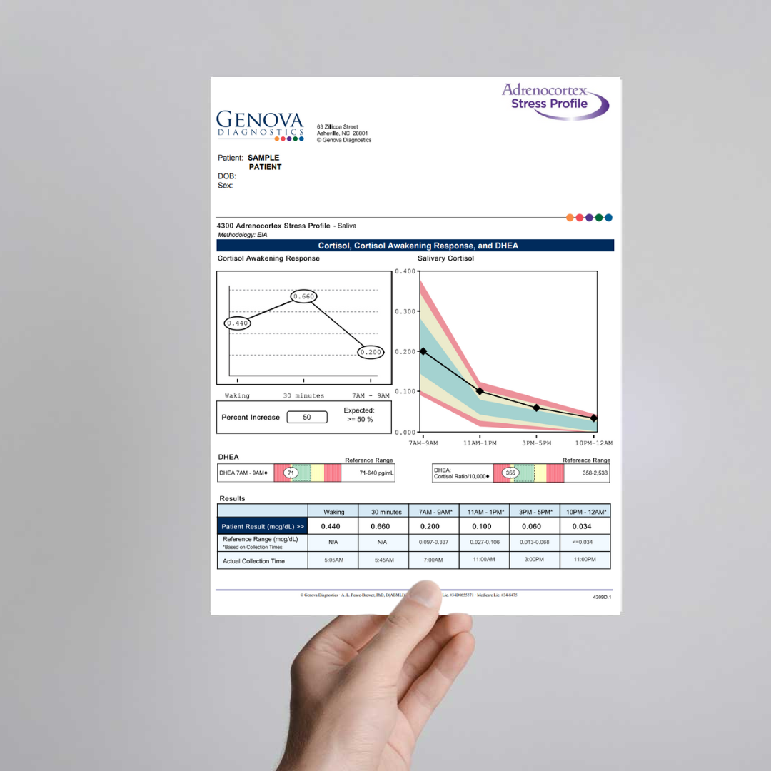 El Perfil de Estrés Adrenocortical (ASP) proporciona una evaluación del eje hipotálamo-hipófisis-suprarrenal (HPA) utilizando muestras salivales cuidadosamente cronometradas de las hormonas cortisol y DHEA. Las pruebas salivales son una opción fácil y no invasiva para medir los niveles de hormonas parentales no unidas y biológicamente activas. El informe ofrece un gráfico fácil de interpretar que muestra los resultados del ritmo diurno natural.