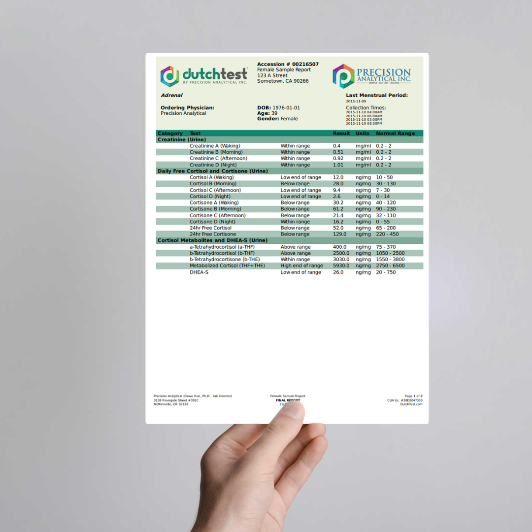 El DUTCH Adrenal proporciona patrones gratuitos de cortisol que se asemejan a la saliva con la adición de mediciones de metabolitos para obtener un marcador mejorado de la producción total de cortisol. ¡Esta prueba se realiza en LC-MS/MS: la forma más precisa de analizar el cortisol y los metabolitos!