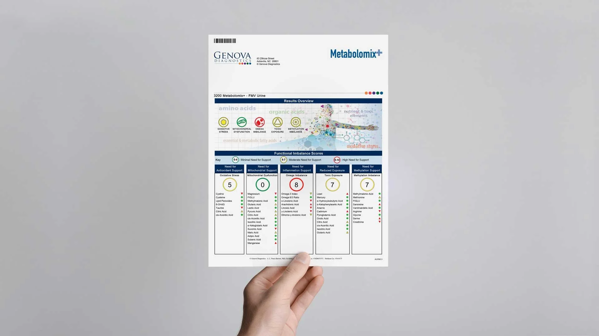 El Metabolomix+ es una combinación única de pruebas nutricionales con un gran espectro de biomarcadores que identifican deficiencias nutricionales, desequilibrios metabólicos, exposición a toxinas ambientales o disfunciones intestinales. De forma no invasiva y amigable para el paciente, con una recolección de orina se evalúa la necesidad funcional de antioxidantes, vitaminas B, minerales, ácidos grasos, aminoácidos e identificar procesos metabólicos esenciales. Con la opción adicional de un pinchazo en el dedo para recolección de sangre en papel y un hisopo bucal se puede ampliar el alcance de la prueba. El Metabolomix+ es clave para resolver enfermedades de raíz, personalizar los tratamientos y satisfacer las necesidades precisas de cada paciente.