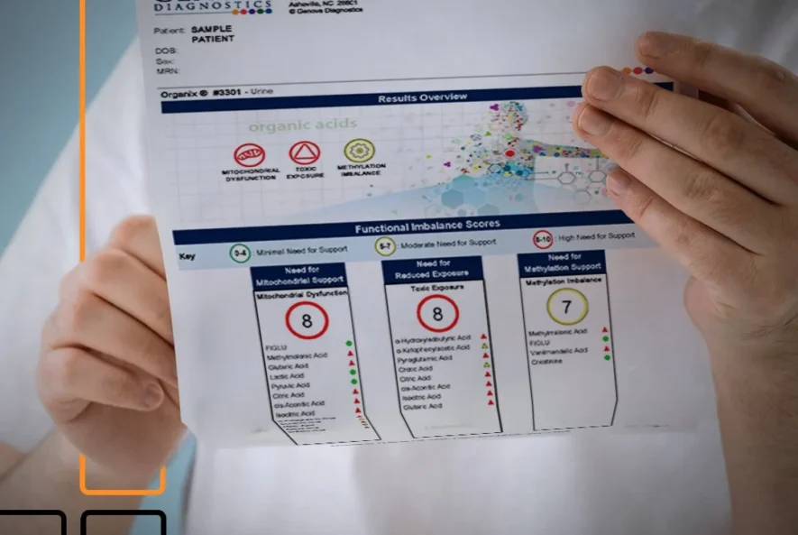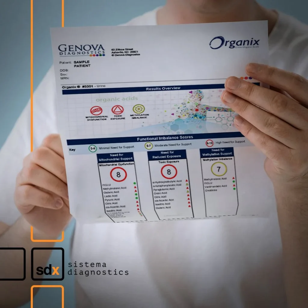 El Organix® Comprehensive Profile de Genova Diagnostics es una prueba funcional no invasiva que el paciente recolecta en casa. Analiza ácidos orgánicos clave agrupados en seis áreas metabólicas (energía mitocondrial, estrés oxidativo, neurotransmisores, disbiosis, metabolismo de ácidos grasos y vitaminas del complejo B), entregando un reporte fácil de interpretar y con intervenciones nutricionales sugeridas.