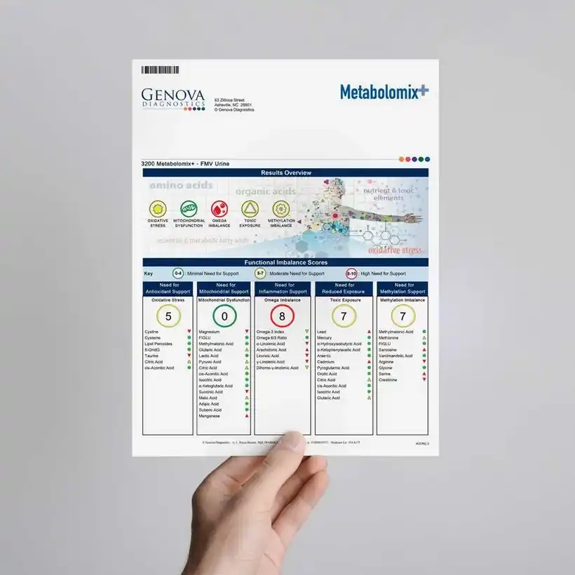 Se proporciona un conjunto completo de recomendaciones personalizadas para aminoácidos, ácidos grasos, vitaminas, minerales, apoyo digestivo y otros nutrientes para que puedas maximizar tu salud. Las pruebas también pueden revelar exposiciones tóxicas y medir la capacidad de tu cuerpo para neutralizar esas toxinas
